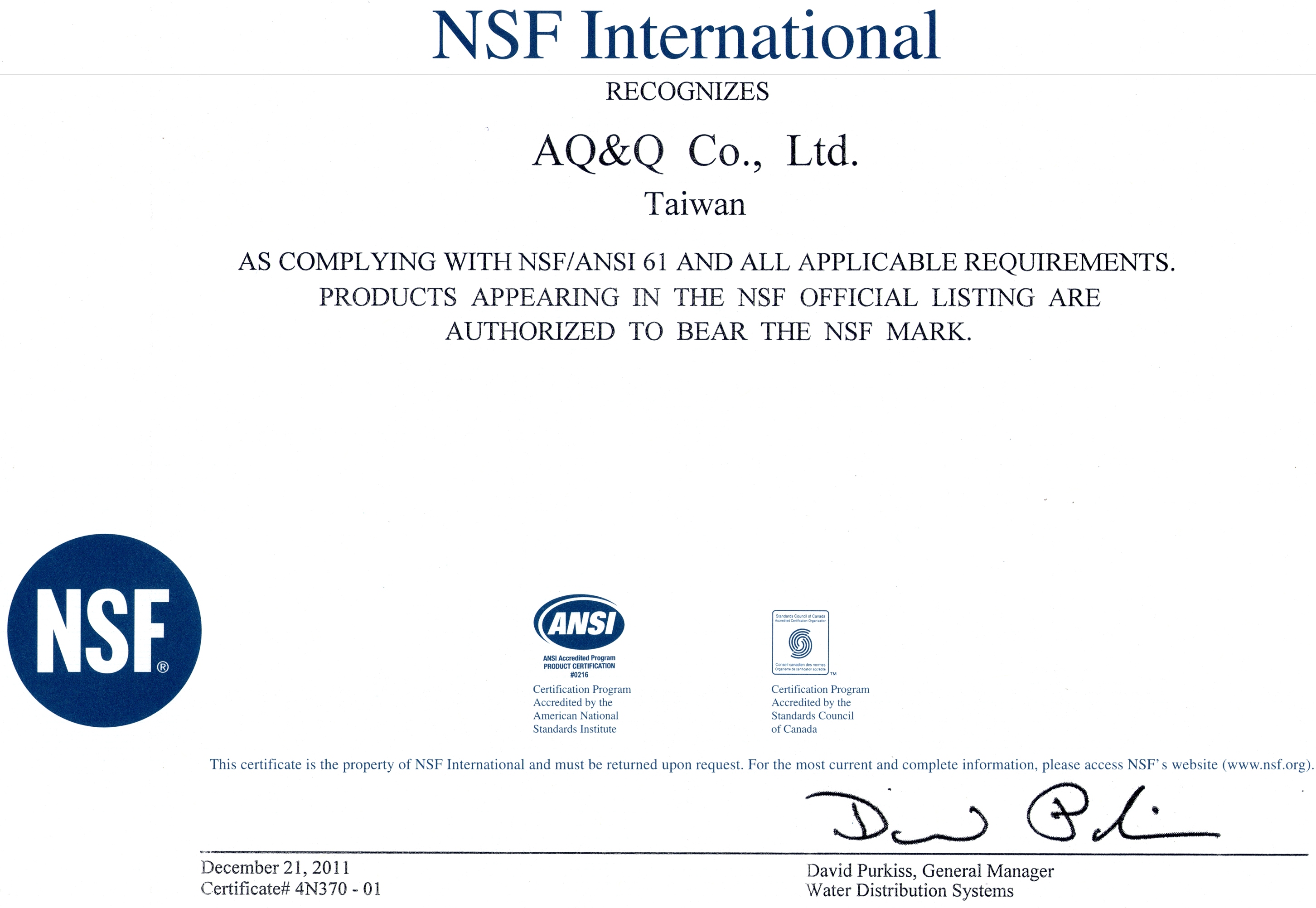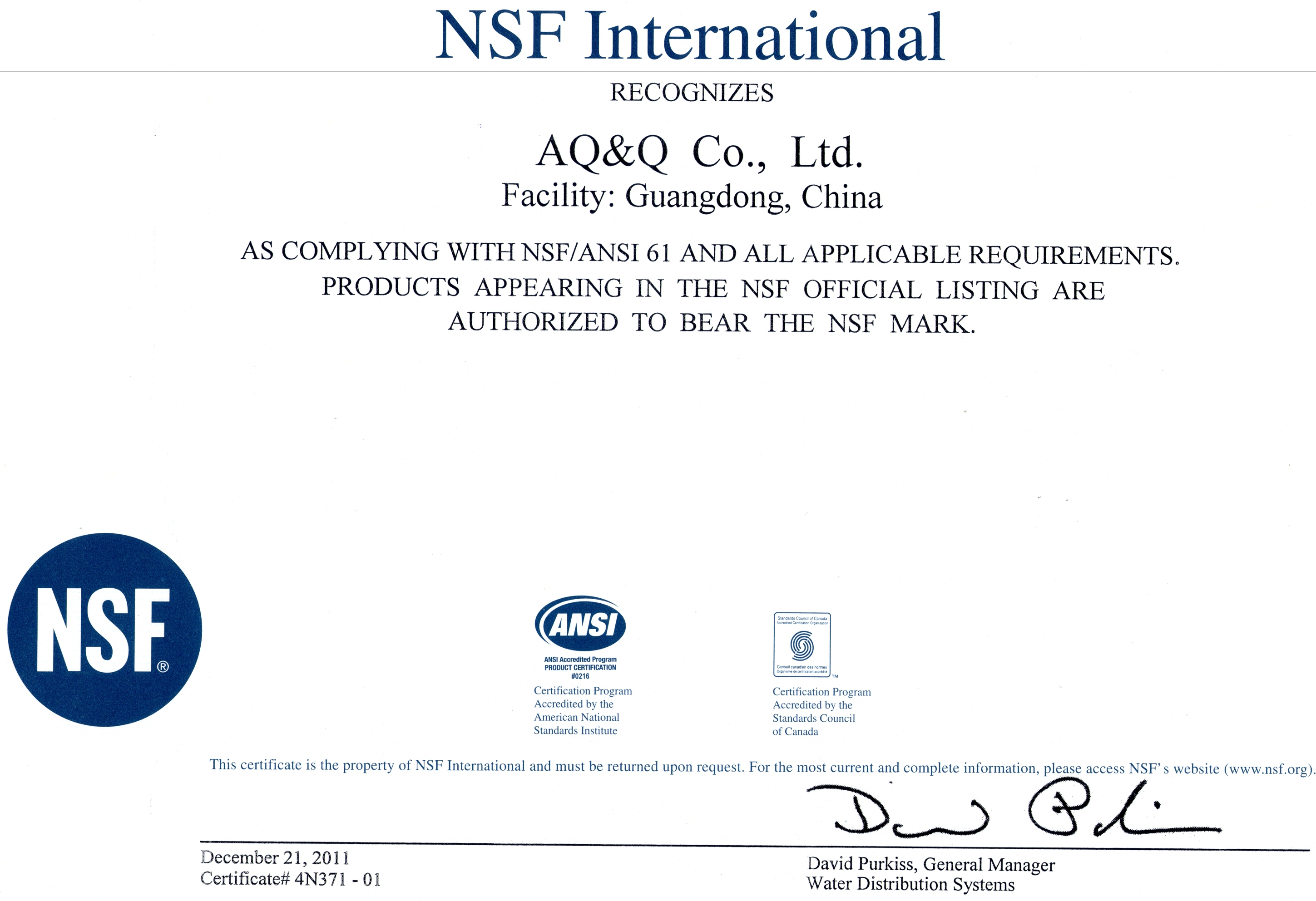 AQ&Q a obtenu de nombreuses certifications internationales, telles que NSF, CE, RoHS 2.0, UR et bien d’autres.